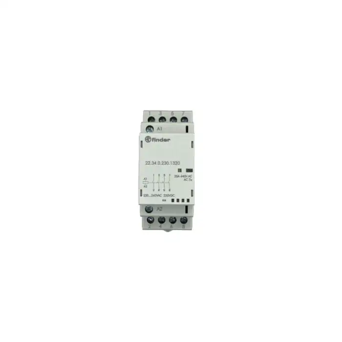 Finder kontaktor model 22.34.0.230.1320 namenjen je za upravljanje trofaznim uređajima sa nazivnom strujom do 25 A i snagom do 4 kW pri 400 V AC. Opremljen je sa 4 kontakta ,materijalom AgNi. Radi na kontrolnom naponu 230 V AC/DC sa radnim opsegom 184-264 V. Montira se na DIN šinu i poseduje mehanički prikaz, LED indikatore. Kontaktor ima duži vek trajanja i pouzdano radi sa visokim strujama i impulsnim opterećenjima.