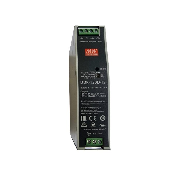 DC-DC pretvarač snage 120 W sa jednim izlazom 12VDC / 10A. Radi u širokom ulaznom opsegu od 67.2–154VDC i obezbeđuje stabilisan izlazni napon od 12VDC. Namenjen za montažu na DIN letvu, sa pasivnim hlađenjem, idealan je za industrijske i sigurnosne aplikacije gde je potrebna pouzdana i stabilna konverzija napona.