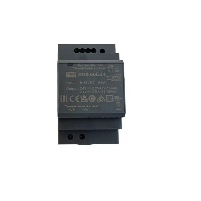MEAN WELL DDR DC/DC pretvarač od 60 W za DIN šinu, sa ulazom 9–36 V DC, izlazom 24 V DC, efikasnošću 91% i višestrukim zaštitama za pouzdan rad.