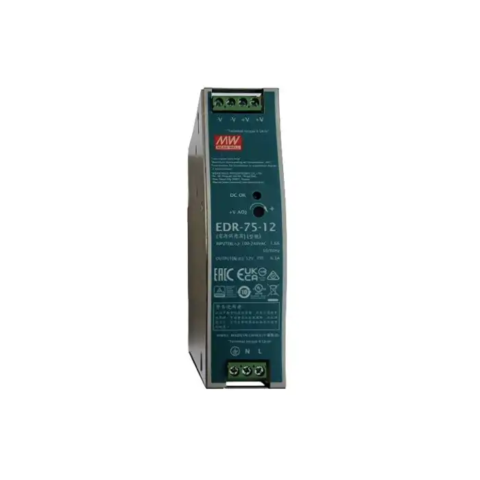 Napajanje za DIN šinu snage 75,6 W sa jednim izlazom 12VDC / 6.3A. Stabilisan izlazni napon od 12VDC i širok ulazni opseg 90–264VAC. Kućište za DIN letvu i pasivno hlađenje obezbeđuju pouzdanu i efikasnu primenu u industrijskim i sigurnosnim sistemima.