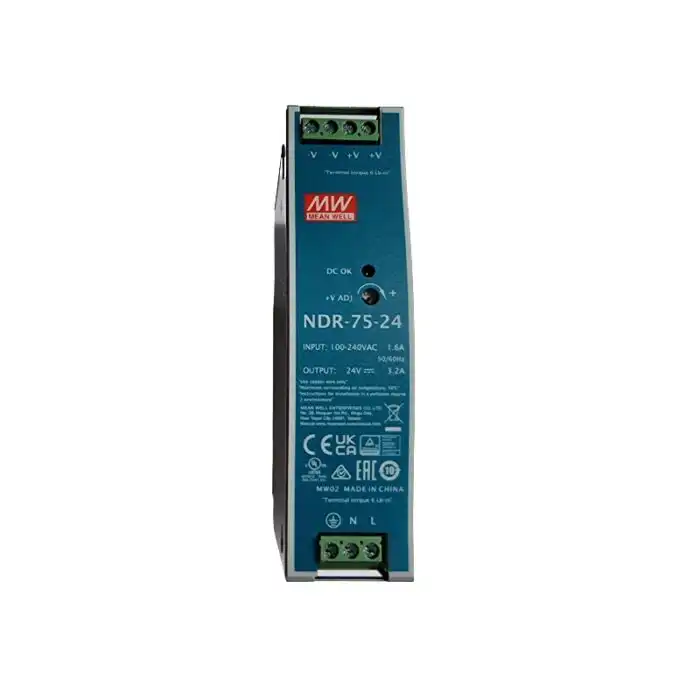 DIN šinski napajanje snage 76,8 W sa stabilizovanim izlazom 24 VDC i strujom do 3,2 A, pasivnim hlađenjem i jednim izlazom za pouzdano industrijsko napajanje.