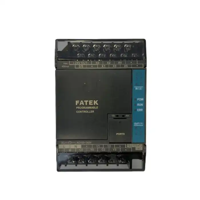 Fatek FBs-10MAT PLC sa 6 digitalnih ulaza (do 20 kHz), 4 relejna ili tranzistorska izlaza (do 20 kHz), RS232/USB portom i neproširivim I/O sistemom. Idealan za manje automatizovane sisteme.