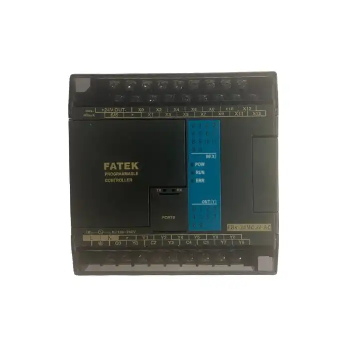 FATEK FBs-24MCJ2-AC je programabilni logički kontroler (PLC) sa 14 digitalnih ulaza i 10 tranzistorskih izlaza, namenjen za industrijsku automatizaciju.