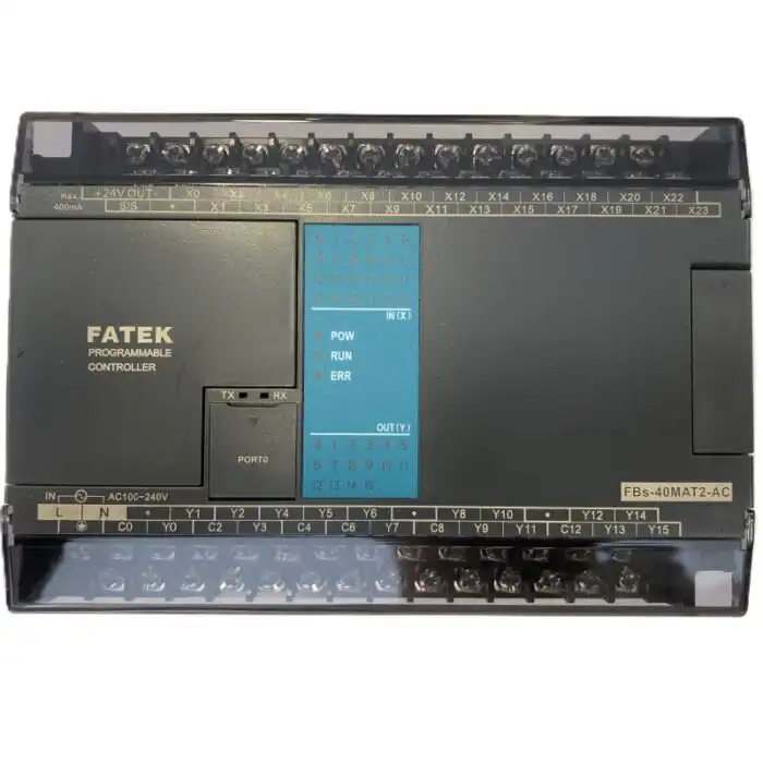Fatek FBs-40MCT2-AC PLC sa 24 digitalna ulaza, 16 relejnih ili tranzistorskih izlaza, brzim ulazima/izlazima do 200 kHz, ugrađenim RTC-om i RS232/USB portom.