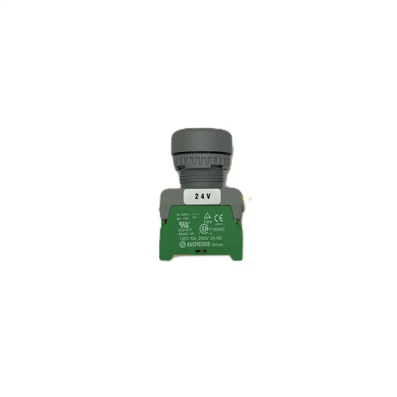Auspicious LXB22 svetleći zeleni taster (24V) je momentni industrijski taster sa LED osvetljenjem, dizajniran za upravljanje i signalizaciju u kontrolnim i industrijskim sistemima.