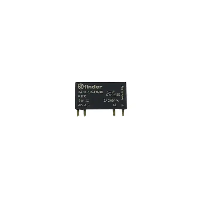 Subminijaturni PCB releji, poluprovodnički (SSR), 1 NO (SPST-NO), 2 A, 2 A – 240 V AC, verzija sa DC ulazom, nazivni napon 24 V, radni opseg od 16 do 30 V, nazivna snaga 0.17 W, potrošnja 7 mA, napon pri kome se relej isključuje (must drop-out) 10 V, impedansa 3430 Ω, radna temperatura od -20 do +50 °C.